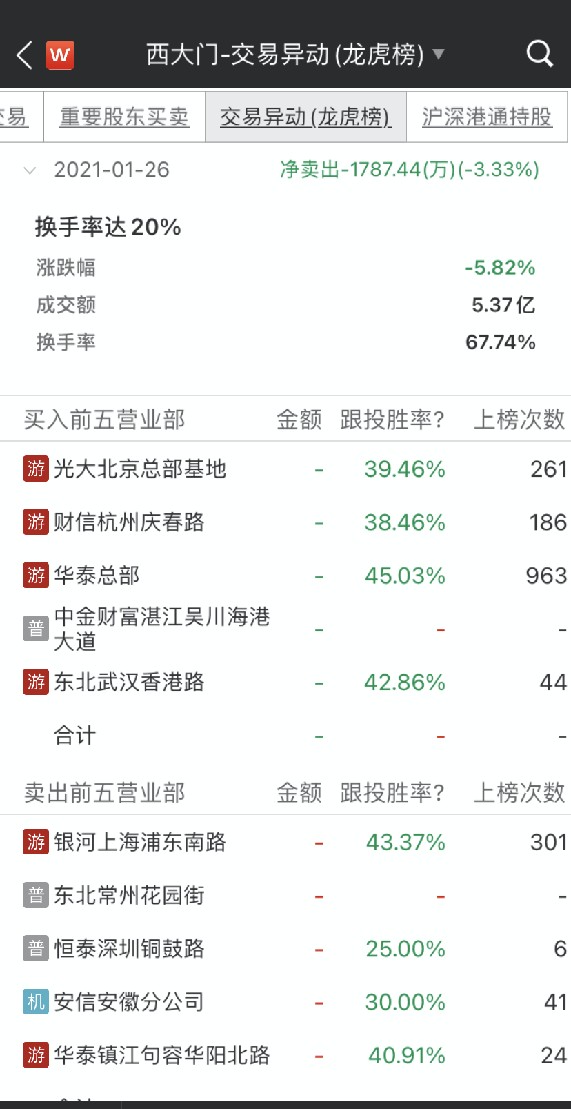 值得一提的是,1月25日,银河证券上海浦东南路营业部曾现身净买入龙虎榜单第一名,当日其净买入1318万元,1月26日,其又净卖出1358万元,排名卖出榜单第一。