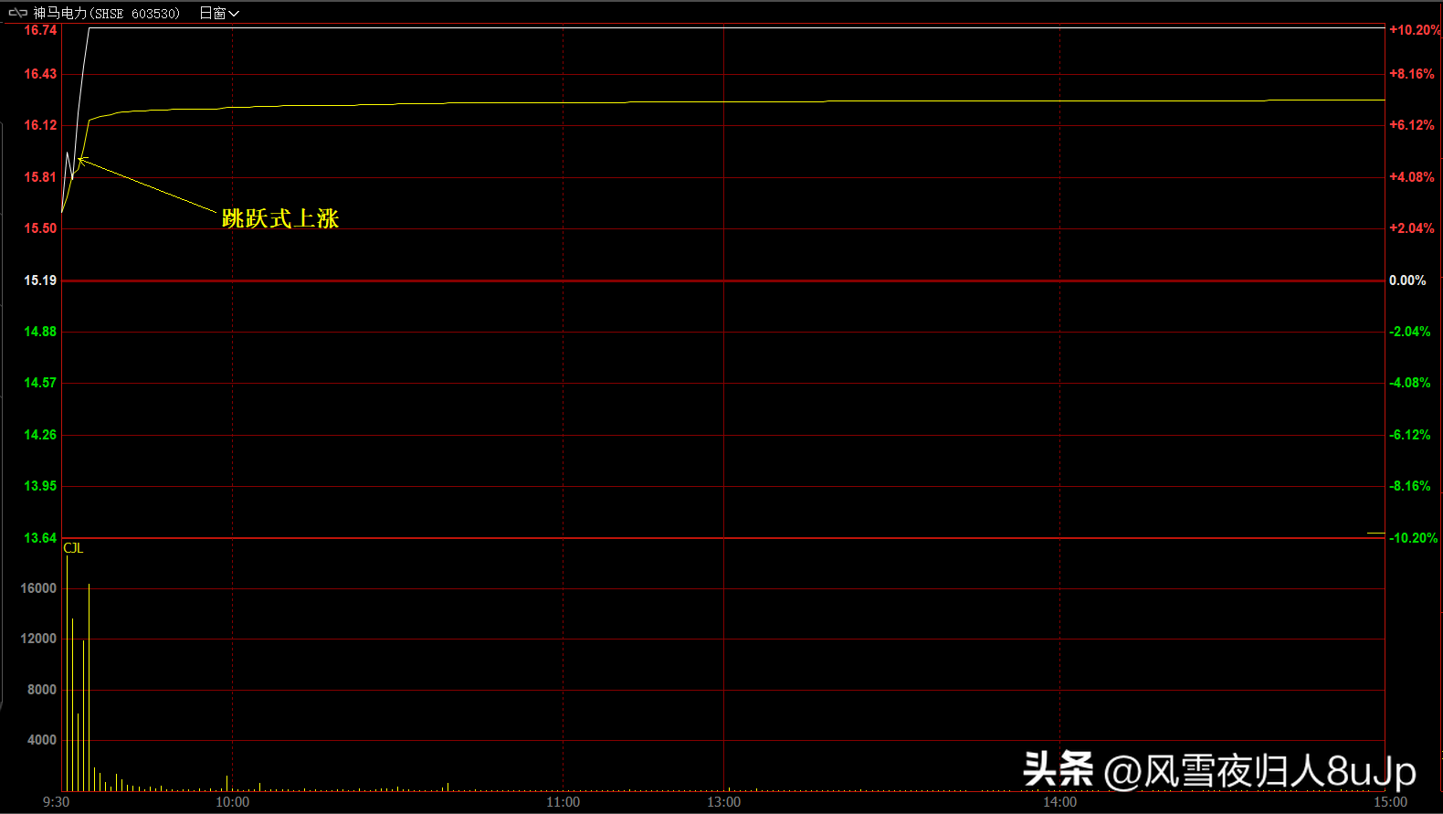 跳跃式上涨是指股价在经过一段盘整之后,突然摆脱盘整区域快速上涨。这种“跳跃”式上涨往往是用一两笔大单快速通吃挂在上方的大单,然后一路狂扫,分时走势呈现出跳跃性的飚升,快速冲击涨停板,有时分时走势几乎以90度上攻涨停板。在攻击涨停板时,攻击波的次数越少,形成的暂时休整平台越少,则后期涨势越猛;次数越多,形成的暂时休整平台越多,则涨势越弱。跳跃式上涨往往伴随着巨量大单的密度成交。