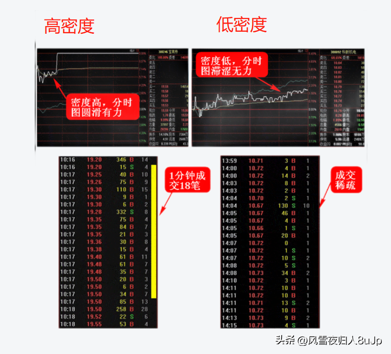 一支股票要涨停,必须伴随着高密度的挂单和高度的成交。一般情况下,挂单密度越大则成交密度也越大,反之亦然。而成交密度是指在单位时间内成交的笔数。正常情况下,之前深沪交易系统而言,每分钟最大的撮合成交的笔数为12笔(当有也有成交18笔的),一支股票在每分钟成交的笔数越接近这个数字,就表明它的成交密度越大,则攻击涨停板的概率就越高,反之,成交密度越小,则涨停的概率也就越小。同时,高密度成交在分时图上往往表现为分时走势平滑有力,而低密度成交往往表现为分时走势滞涩无力,其每分钟成交的笔数可以在分笔成交明细中看到。