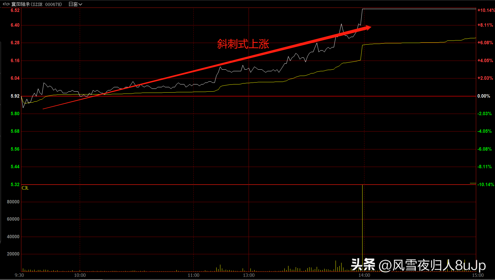 斜刺式上涨,是指股价从某一个价位起涨后,中间没有明显地停顿,沿着一个规定的角度逐波上推,形同一根斜刺一样刺向涨停板。这种上涨没有明显的单次攻击波型,但是也没有明显的暂时盘整平台,所以上涨速度总体也可以。但这种庄家的势力往往较弱,不够强大,后期的上涨比跳跃式上涨要差。