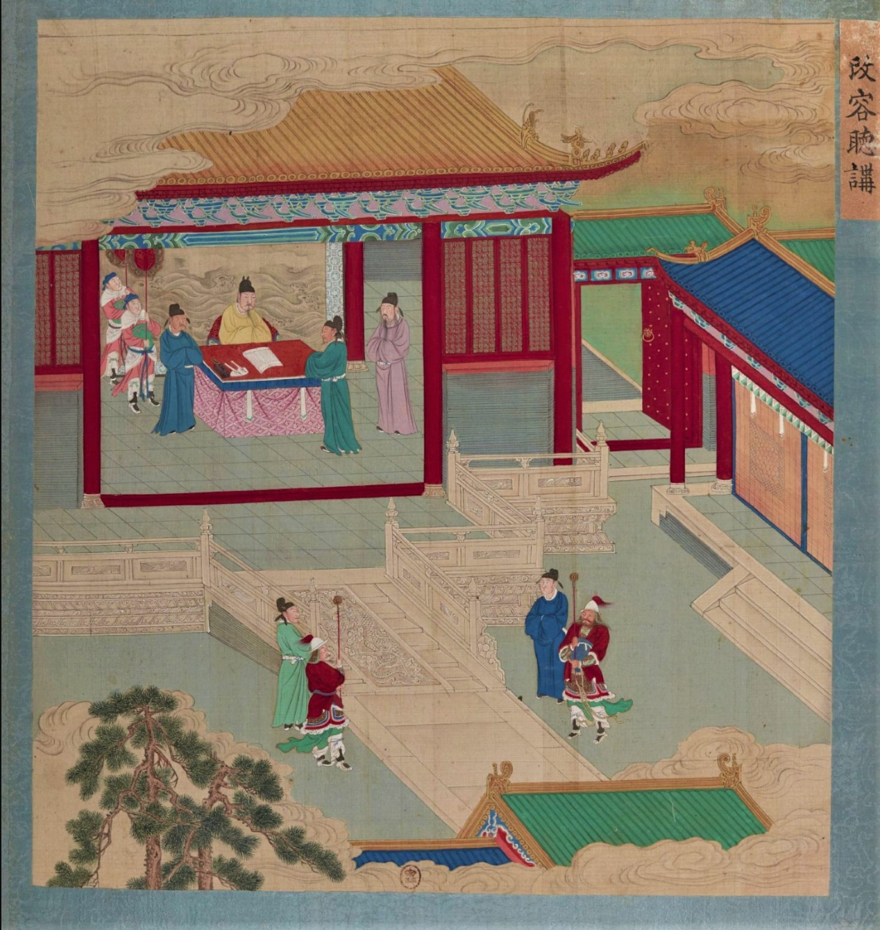 清初彩绘版《帝鉴图说》之《天章召见》。该图讲述宋仁宗在皇家图书馆天章阁召见大臣,咨询时政阙失,请众臣畅所欲言。(法国国家图书馆藏)