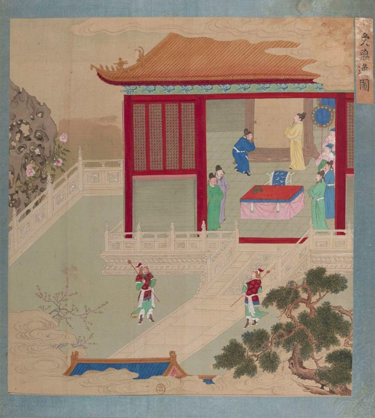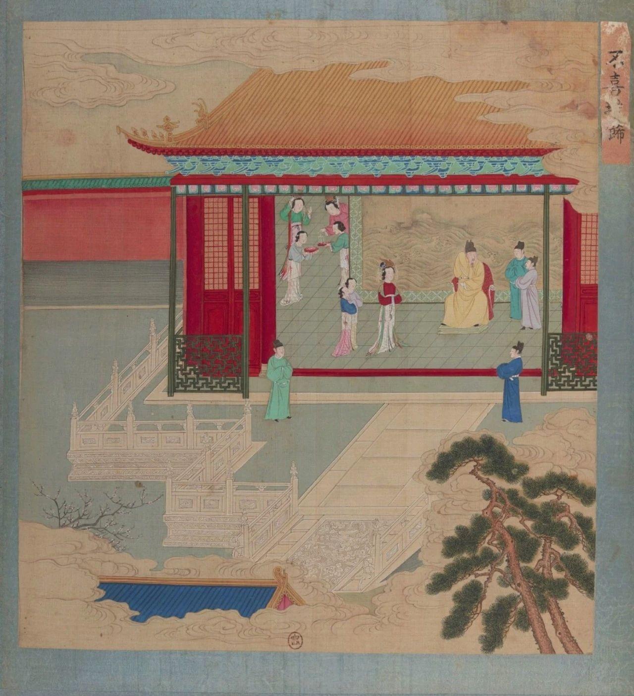 清初彩绘版《帝鉴图说》之《纳谏遣女》。该图讲述宋仁宗听从台谏官的规劝,忍痛割爱,将臣下进纳的漂亮宫女遣送出宫。(法国国家图书馆藏)