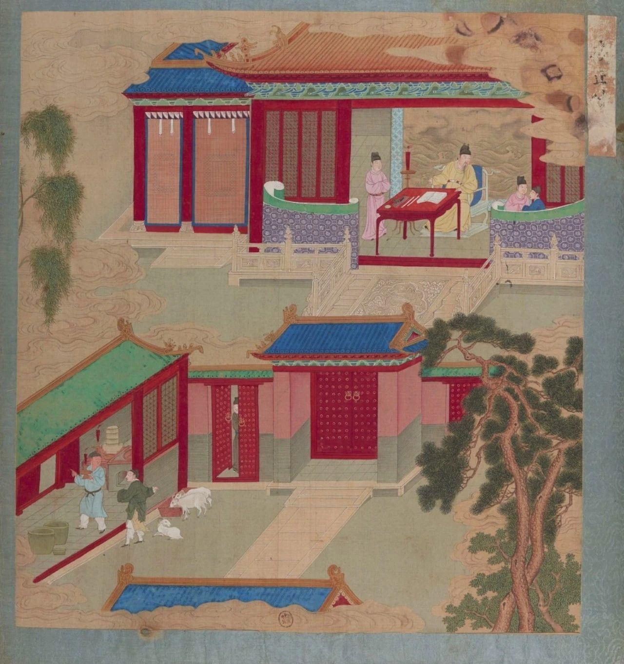 清初彩绘版《帝鉴图说》之《夜止烧羊》。该图讲述宋仁宗一日深夜因“不寐而饥”,想吃烤羊肉,却“不忍一夕之饥而启无穷之杀”,宁可忍饥失眠。(法国国家图书馆藏)
