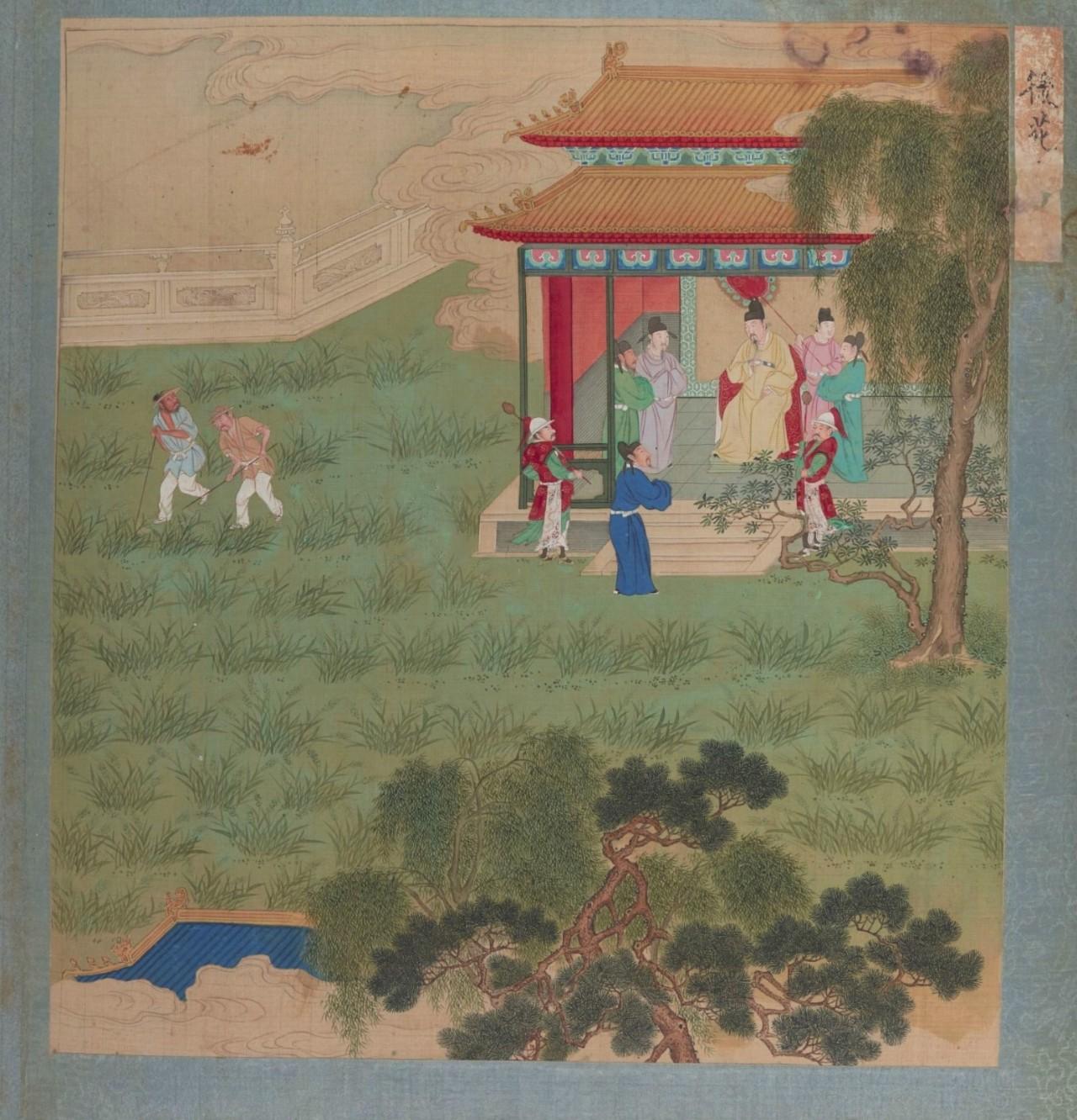 清初彩绘版《帝鉴图说》之《后苑观麦》。该图讲述宋仁宗在后苑开辟出一块田园,不种花卉,只种麦子,以观“稼穑之不易”。(法国国家图书馆藏)