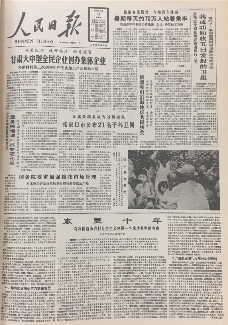 1988年8月14日,《人民日报》用接近1.5个版的篇幅刊登了一份调查报告,主要内容是改革开放10年来东莞的建设成就,称东莞为沿海农村社会主义建设的一个典型。调查报告是由中共中央办公厅调研室的同志在东莞进行30天的综合考察后写出来的,报告认为东莞的崛起,从根本上说,仍然是认真贯彻执行十一届三中全会以来的路线、方针、政策的结果。报告认为东莞的基本经验值得重视