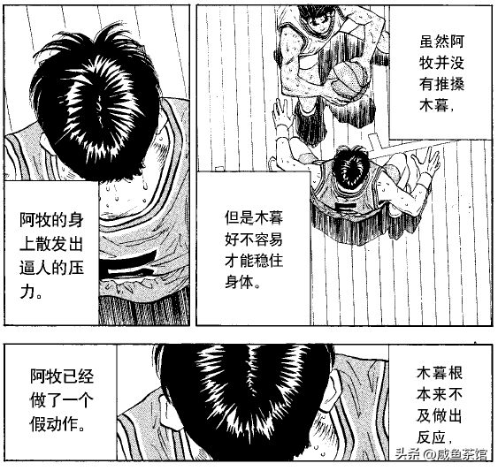牧皇用假动作晃过赤木之后,正准备起跳中投,赤木此时把木暮身体当助力桩,秀出了樱木花道的无僵直二次起跳,成功干扰了牧皇的视线,本来必定命中的一投变成助板。