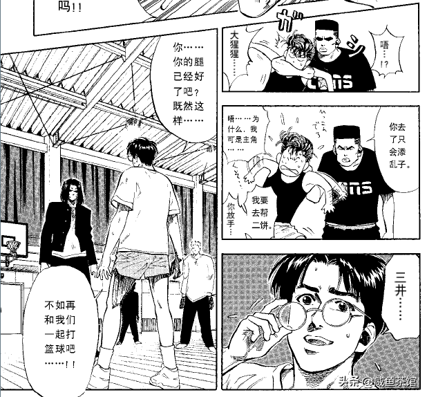 在三井大闹篮球场的时候,木暮在关键时候制止了洋平的输出,并站在了三井面前,试图用残存的队友情唤醒他。