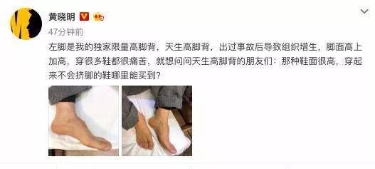 因为这次重创,黄晓明左脚脚背高高隆起变成永久性畸形,平时不得不穿特制的鞋子。但在养伤期间教主仍保持乐观,自称“钢钉侠”,在微博上连载日记,鼓舞身处逆境的人们。