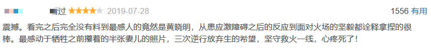 男一号黄晓明最令人惊喜,丢掉偶像包袱,演出了前消防队长内心的纠结与挣扎,以及一个中年父亲对家人深沉的爱。