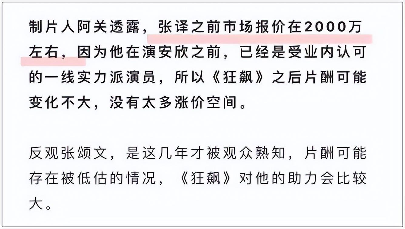 同时制片人还表示,张译能吃到《狂飙》的红利并不多,下部戏的片酬变化不会太大,已经没有上涨空间了。