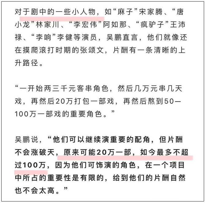 至于其他配角,比如说饰演“麻子”、“唐小龙”、“疯驴子”、“李响”等演员,他们的片酬最低从两三千到几万,戏份多的话,20万就能打包一部戏,如果是重要角色,一部戏能拿到20万到100万。
