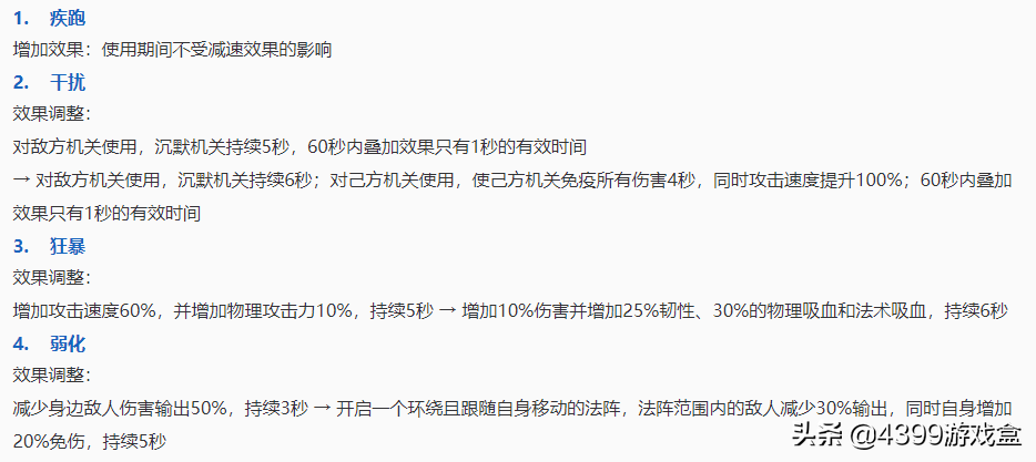 6、四项召唤师技能加强:疾跑、干扰、狂暴、弱化加强!尤其是狂暴,加物理吸血还加法术吸血,我都寻思着下赛季不用回城了,带个狂暴续航爆炸!弱化也可以考虑,辅助神技,成了范围技能,减对方攻击,还减自身免伤!