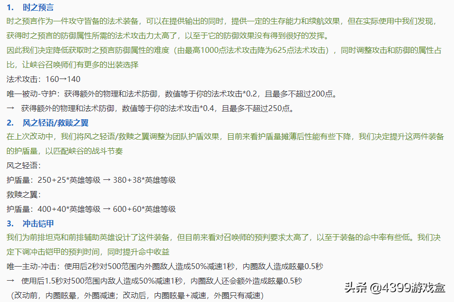 9、四件装备进行调整:时之预言削弱、风之轻语、救赎之翼、冲击铠甲加强!