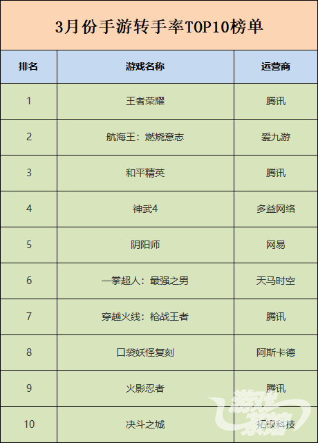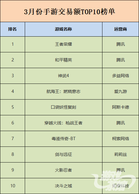 3月份交易额TOP10:《王者荣耀》交易额1325万元 《和平精英》达到592万元