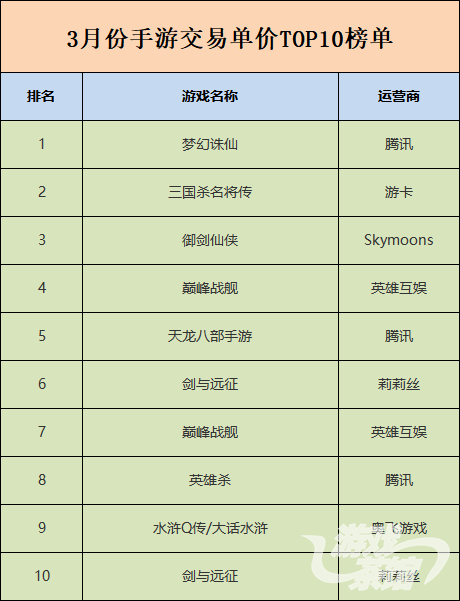 3月份交易单价TOP10:《梦幻诛仙》、《三国杀名将传》出现天价账号