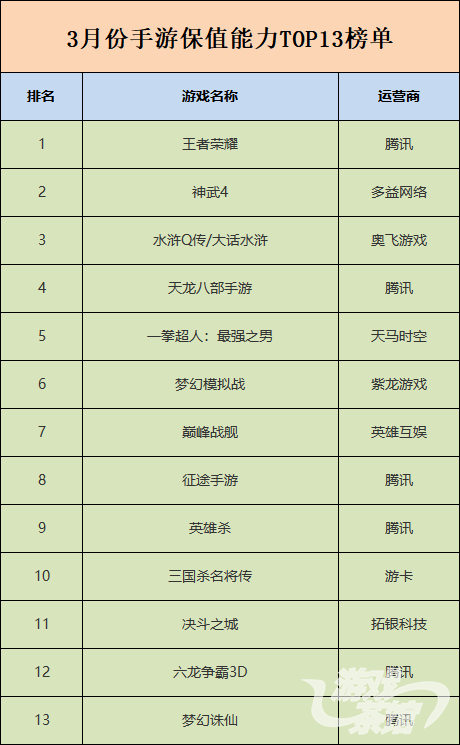 3月份游戏保值能力TOP13:更多类型游戏上榜 MMO品类仍占据优势