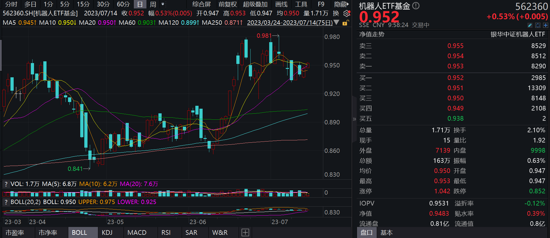 截至9:58,机器人ETF基金(562360)震荡走高,现涨幅达0.53%,成交额持续扩大。