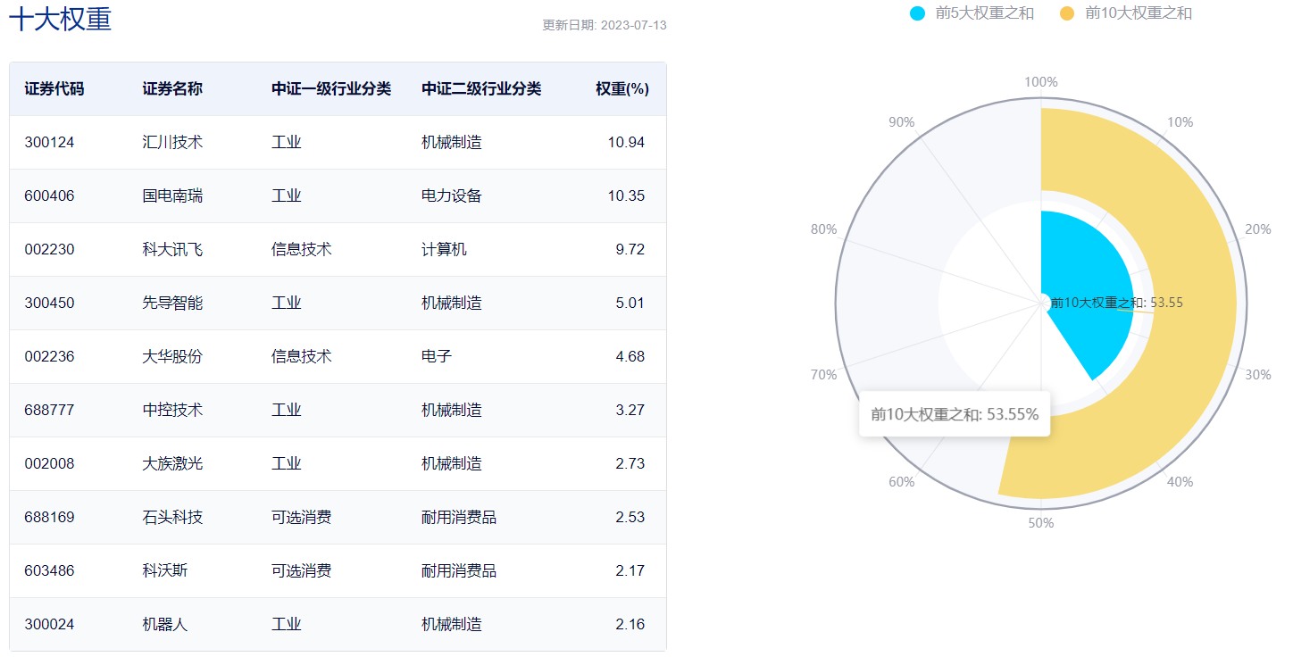 数据显示,截至2023年7月13日,该指数前十大权重股包含汇川技术、国电南瑞、科大讯飞、先导智能、大华股份等,前十大集中度为53.55%。(数据来源:中证指数公司,指数成份股不代表个股推荐)