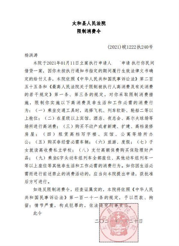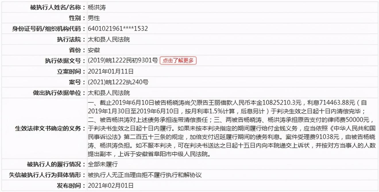 1月26日,据中国执行信息公开网显示,宁夏电影集团董事长、宁夏文化艺术联合会主席杨洪涛被安徽省太和县人民法院认定为失信被执行人,立案时间为2021年1月11日,执行标的11680712元。同时,网站上还显示,2月1日,杨洪涛被太和县人民法院列为“限制消费人员”。
