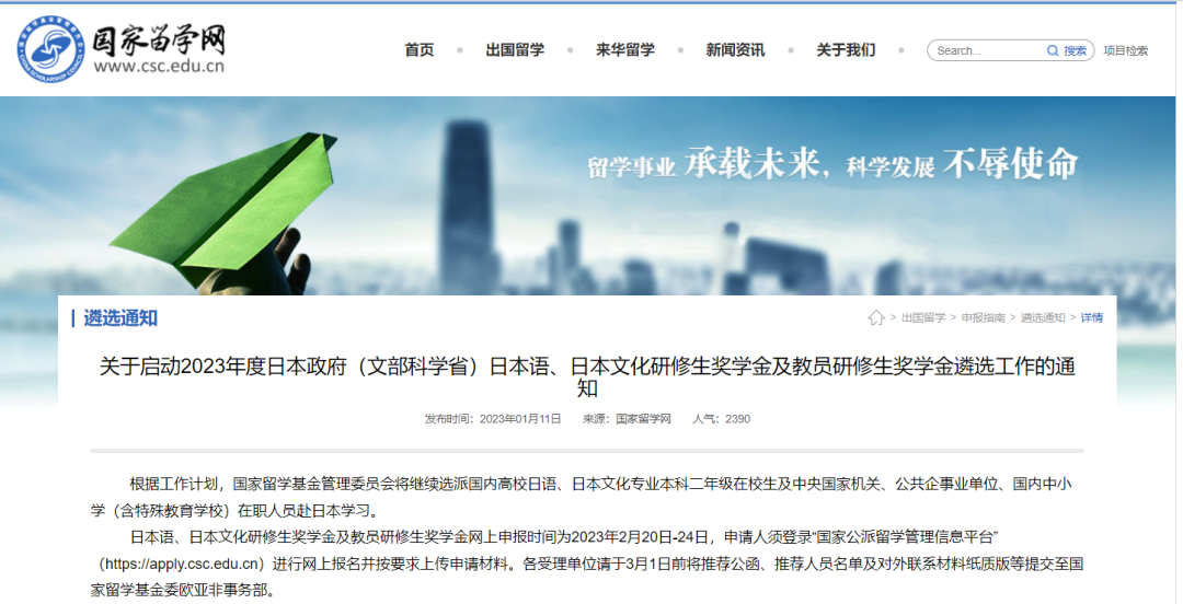 关于启动2023年度日本政府(文部科学省)日本语、日本文化研修生奖学金及教员研修生奖学金遴选工作的通知