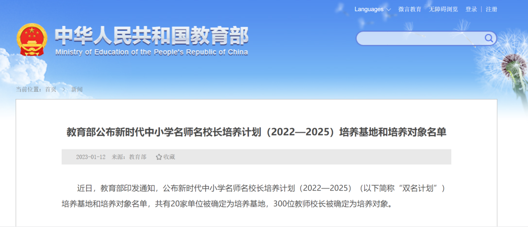教育部公布新时代中小学名师名校长培养计划(2022—2025)培养基地和培养对象名单