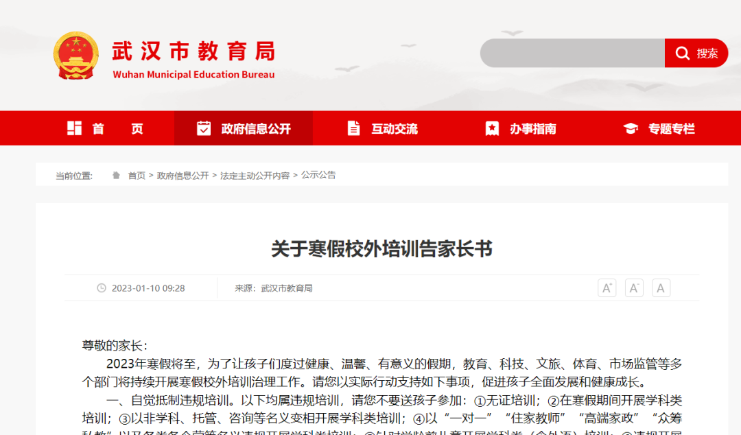 1月10日,武汉市教育局官网发布《关于寒假校外培训告家长书》,其中提到,2023年寒假将至,为了让孩子们度过健康、温馨、有意义的假期,教育、科技、文旅、体育、市场监管等多个部门将持续开展寒假校外培训治理工作。倡导广大家长自觉抵制违规培训;提醒家长若选择校外培训时,有哪些属于违规收费行为;并呼吁家长们参与监督及时举报。