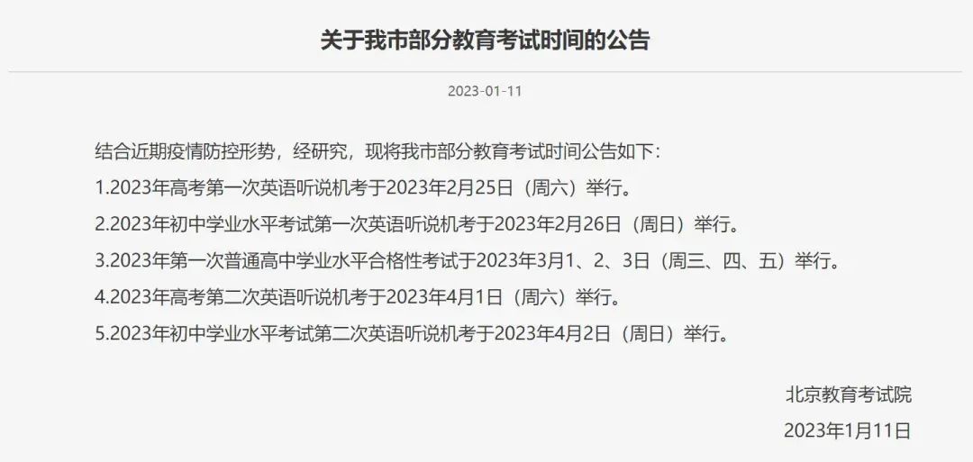1月11日,北京教育考试院发布公告,明确本市部分教育考试时间。其中,2023年高考第一次英语听说机考于2023年2月25日(周六)举行。