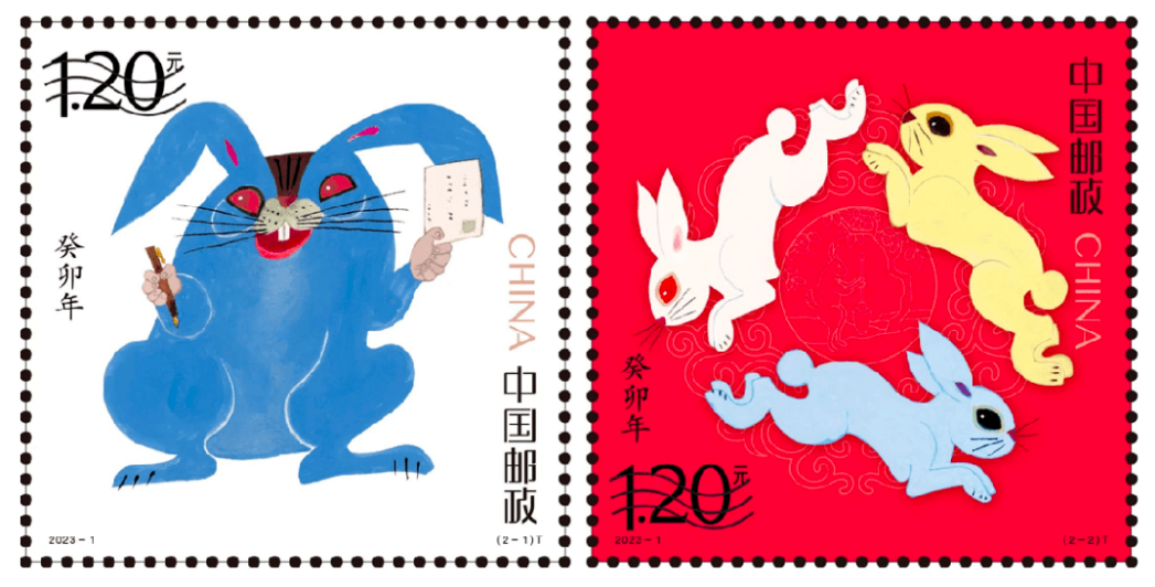 2023年兔年生肖邮票一套两枚,第一枚名为“癸卯寄福”,第二枚名为“共圆共生”。引起争议的是“癸卯寄福”。这张邮票画面中的兔子一手执笔,一手持信,全身蓝色,瞪着红色的眼睛,露出突出的大牙齿,嘴边各四根如钢丝般硬挺的胡须。这个兔子的形象引来了很多网友的吐槽。有人认为,邮票里的蓝色兔子给人一种怪异的感觉,会吓哭孩子;但也有网友认为,该枚邮票的画风虽与众不同,但却敢于设计,这很符合设计者黄永玉大师一贯的“顽童”风格。