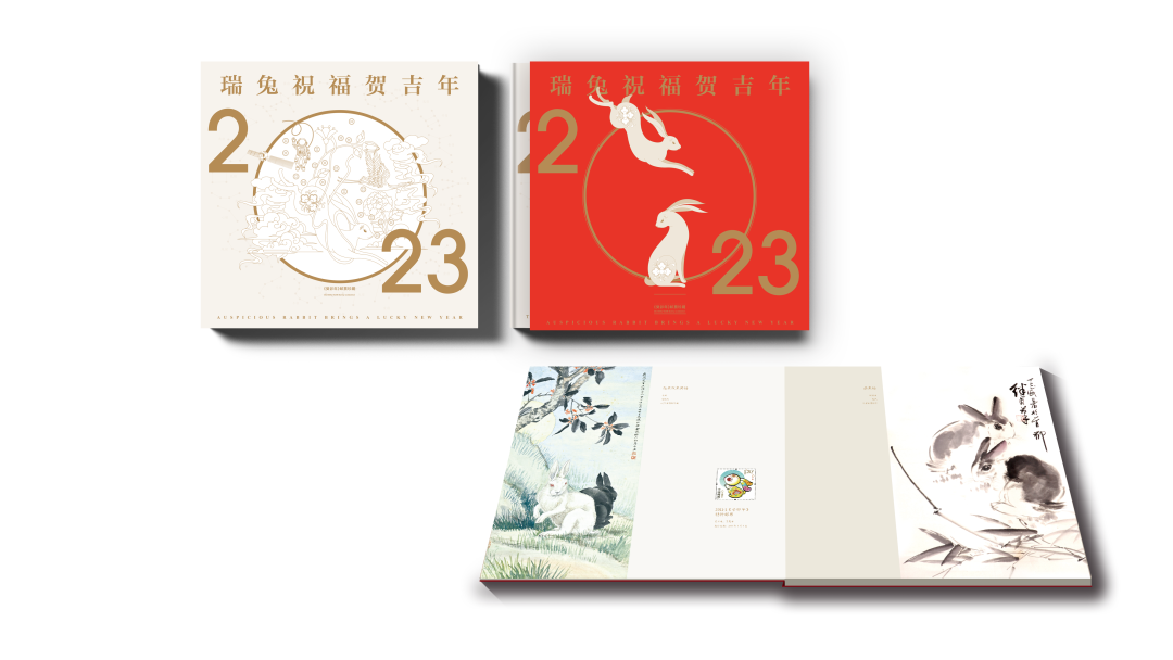 在折类邮品中,PZ折、小版折、大版折在2023年1月5日准时与大家见面。PZ折选用晁谷的绘画作品,生动可爱。折封面的圆形象征着月亮,寓意圆圆满满。小版折画面选用宋鉴画作,以头戴玉兔帽的娃娃和两只小兔做游戏的场景为主视觉元素,背景中的圆形寓意圆满、团圆。背景的云气纹为画面增添了动感。大版折画面同样选用宋鉴画作,以一只奔腾不息的玉兔为主视觉元素,玉兔身上由云气纹构成的吉祥图案寓意着癸卯大吉的美好祝愿。背景的水波纹、云气纹为画面增添了动感。