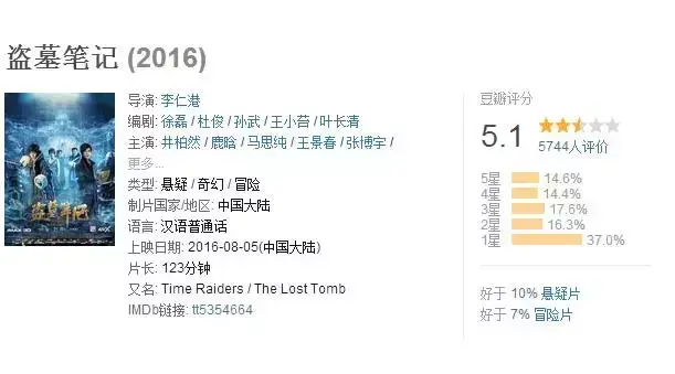 豆瓣网友逼格太高了,给电影盗墓笔记打的分好低。作为一个原著粉,去年爱奇艺我诚心在骂,这部电影虽然也有嘈点,但是也有很多亮点的。盗墓类电影既要惊险刺激又要过审不洗白真的不行。我觉得鹿晗和井柏然演的都不错至少台词功底很好,有人觉得鹿晗下斗跳街舞那段好苏,可是我喜欢~我要二刷了。