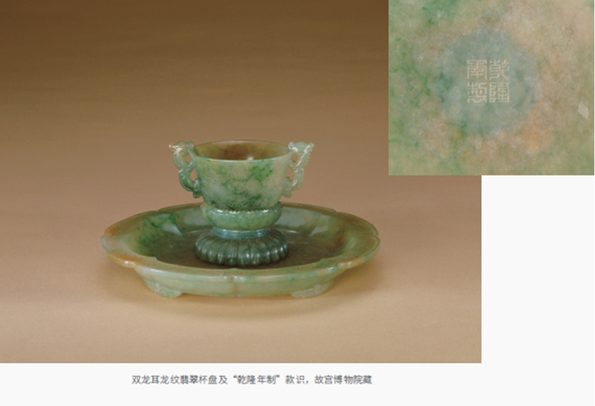 双龙耳龙纹翡翠杯盘及“乾隆年制”款识,故宫博物院藏(《看见故宫》插图)。