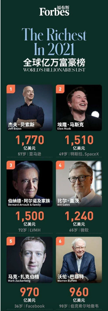 (图说:2021福布斯富豪榜排名前6的亿万富豪)