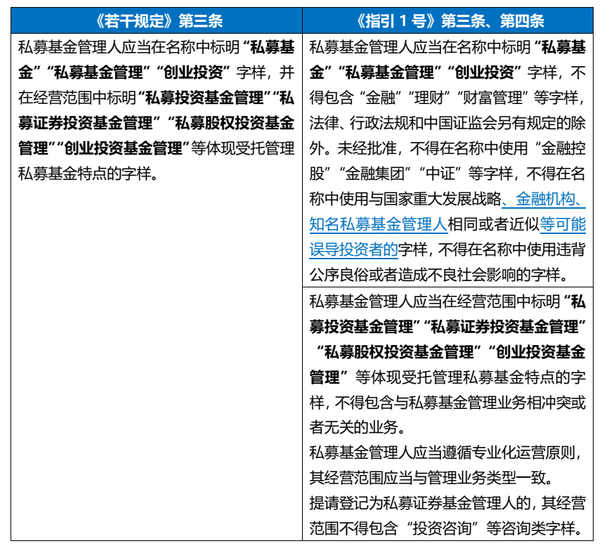 就管理人名称和经营范围的必备字样,《指引1号》的规定和《若干规定》要求一致。在此基础上,《指引1号》从反面强调了管理人名称和经营范围中不得包含的字样。值得注意的是,《指引1号》正式版本新增要求管理人名称中不得使用与金融机构、知名私募基金管理人相同或者近似字样。我们理解,基于文本上同时增加了“可能误导投资者的”的限制条件,协会并不限制与金融机构、知名私募基金管理人属于同一集团/或获得合法授权的新设管理人使用相同或近似字样。