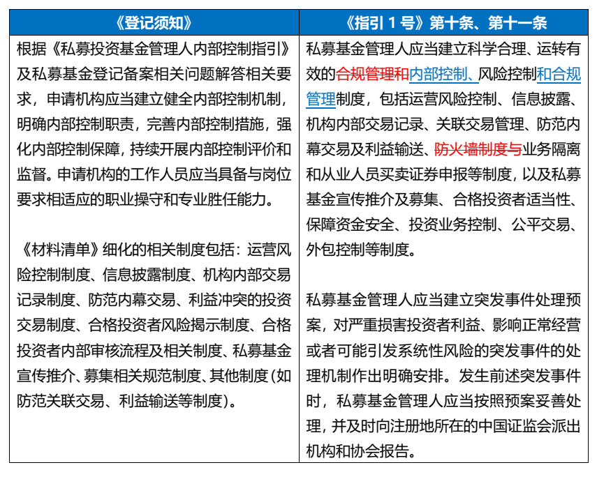 相较《登记须知》和《材料清单》提出的内控文件要求,《指引1号》规定的制度类型范围更广,且要求管理人建立突发事件处理预案。就哪项具体制度需要提交协会,待后续根据协会资产管理业务综合报送平台(“