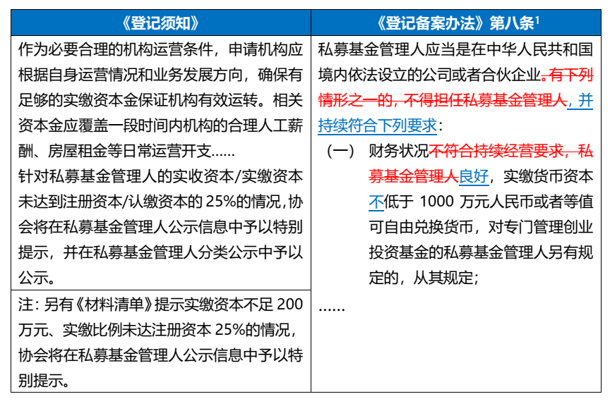 《登记须知》和《材料清单》对管理人实缴资本未规定硬性要求,实缴资本低于200万元人民币的情况会在公示信息中特别提示。《登记备案办法》明确将实缴资本不低于1000万元人民币作为管理人的持续合规要求之一,即管理人在登记时和后续运营过程中认缴和实缴资本均不得低于1000万元人民币(专门管理创投基金的管理人另有规定除外)。新规较大程度提升了对管理人资本金的要求,提示在前期架构搭建和资金准备的过程中重点关注。