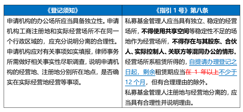 如协会此前审核的一贯要求,管理人需要独立、合适的办公场地,且提交登记时应当装修完毕,基本具备办公使用条件、有显示管理人字号的独立前台等。《指引1号》对实操审核要求进行了明文规定,包括明确审核反馈中提出过的具体问题:(1)不得使用共享空间,(2)不得与股东、合伙人、实际控制人、关联方等存在混同办公,(3)从提交登记申请起租赁期应不少于12个月。考虑到实践中部分管理人的办公场所由其股东或关联方提供,新规未直接限制该等办公场所的使用,但需注意避免混同,不同机构的办公场所应有所区隔、体现独立性。此外,考虑到准备管理人登记申请材料需要一定的时间且准备过程中伴随诸多不确定因素,建议在租赁管理人经营场所时,适当考虑准备时间并约定一个较长的租赁期限。