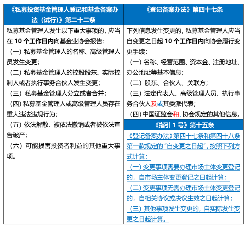 实践中就“自变更之日起”存在争议已久,《指引1号》给出了明确的计算方式,提示各管理人关注信息变更的时限要求。长期以来,信息更新不及时都是实践中管理人运营不规范的常见问题,证监会的私募专项合规检查和协会自律检查的案例中也多有因未及时更新管理人及其从业人员的有关信息而被采取行政监管措施或其他自律措施的情形。