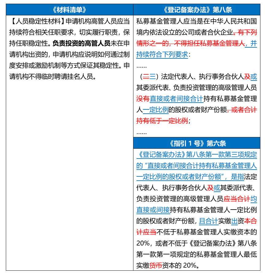 《登记备案办法》和《指引1号》要求法定代表人、执行事务合伙人或其委派代表、负责投资管理的高管均持有管理人一定比例股权或财产份额,且实缴出资合计最低为200万元人民币。值得注意的是,相较于征求意见稿,首先,《登记备案办法》明确高管持股可以为直接持股也可为间接持股,我们理解属于文义上的明确;其次,《指引1号(征求意见稿)》中就高管是否各自均需持股或是在某一高管满足持股比例的情况下其他高管可不持股,是存在一定解释空间的,正式出台的《指引1号》已经明确为前者。《材料清单》和过往实操反映了协会鼓励管理人和高管进行股权上的绑定,但仍有一定的空间,在高管范围上仅明确了“负责投资的高管人员”,且允许通过管理人出具人员稳定性说明的方式进行解释。但根据新规正式版本的规定,未来实操似乎不会再允许通过提交人员稳定性说明的方式来豁免高管持股。