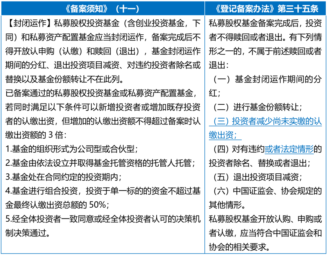 “封闭运作要求”系在《备案须知》中首次提出,具体要求包括两个方面,一方面,除特定情形外,既有投资人不应任意退出;另一方面,备案完成后,增加募集规模应符合特定条件。