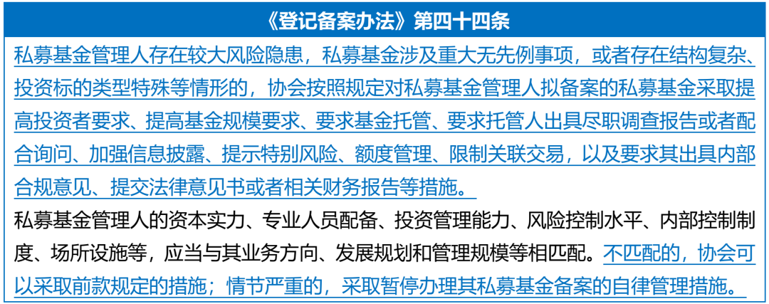 尽管正式出台的《登记备案办法》较征求意见稿阶段就适用情形已进行了简化,但不难看出,“审慎备案”的机制,客观上赋予了基金业协会在特殊情况下,在已有规定基础上“审慎”提高备案要求的权限,可以采取的措施包括提高投资者要求、提高基金规模要求、要求基金托管等备案前机制,也包括了加强信息披露、额度管理、限制关联交易等基金运作过程中的限制,并可以要求托管人、律师事务所等中介机构出具相关报告,通过第三方对基金运作情况予以确认和监督。