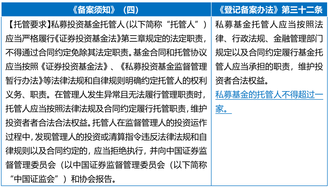 《登记备案办法》首次在协会规则中正式明确,私募基金的托管人不得超过一家。我们理解该项要求与基金业协会禁止双管理人模式的思路类似,也即私募基金的托管职责也应由确定且唯一的托管人履行,强化主体责任,避免“托而不管”。