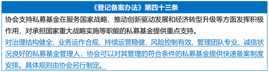 如上所述,差异化监管、扶优限劣是本次修订中体现出的原则之一,也是基金业协会一段时间以来各项监管实践的总结。《试行办法》中仅就创业投资基金的差异化监管进行了明确,《登记备案办法》在此基础上进行了进一步的拓展。一方面明确了基金业协会将对承担国家重大战略实施等职能的私募基金提供重点支持,此前基金业协会对于上市公司纾困基金、抗疫基金等的支持即为该原则的体现;另一方面,也明确了向符合要求的私募基金管理人提供快速备案制度安排,一直以来未通过规范予以明确的“分道制”安排有望细化出台。
