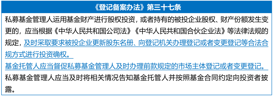 工商确权要求在此前的《备案须知》中主要体现在投资人层面,也即对于公司制、合伙制基金而言,管理人应及时为投资者进行工商确权登记,保障投资人权益。上述“投资确权”规定,将要求的范围拓宽至了项目层面,也即管理人应当在股权投资完成后,及时完成投资确权,确保基金享有出资人的各项权利。值得注意的是,上述规定还要求托管人督促管理人及时办理相关确权登记。