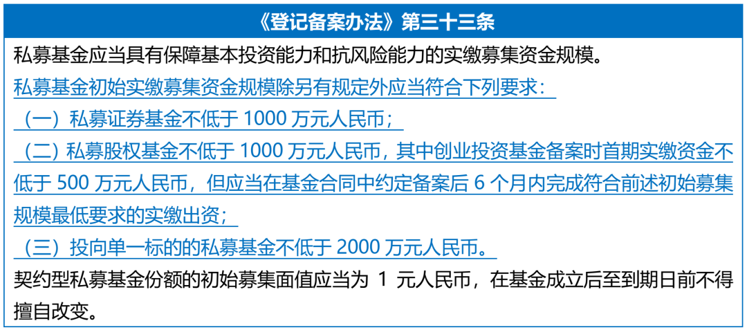 。《登记备案办法》上述第三十三条,按照类别分别明确了规模要求,且为“初始实缴募集资金规模”,标准较合格投资者要求有了大幅提高。