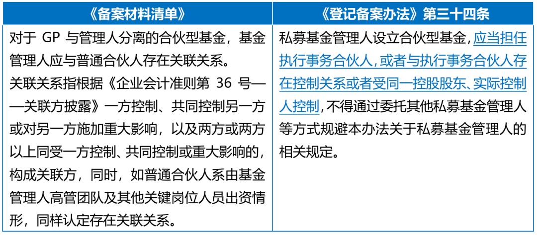 上述规定在原有合伙制基金对于普通合伙人和管理人应当具有关联关系的要求基础上进行了进一步延伸。一方面,将原有要求建立关联关系的主体由“普通合伙人”调整为“执行事务合伙人”;另一方面,在关联关系的认定方式上,删去了“基金管理人高管团队及其他关键岗位人员出资”的情形,仅保留了“控制”的认定标准。