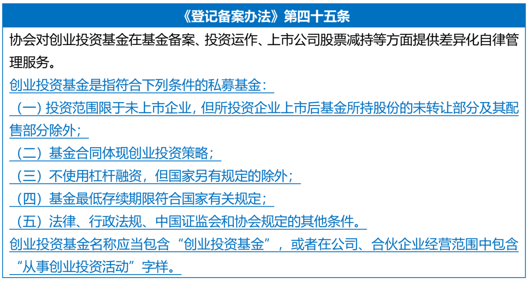 对于“创业投资基金”进行差异化监管,已经不是第一次在监管规范中体现。基金业协会早期的《试行办法》,中国证券监督管理委员会(“