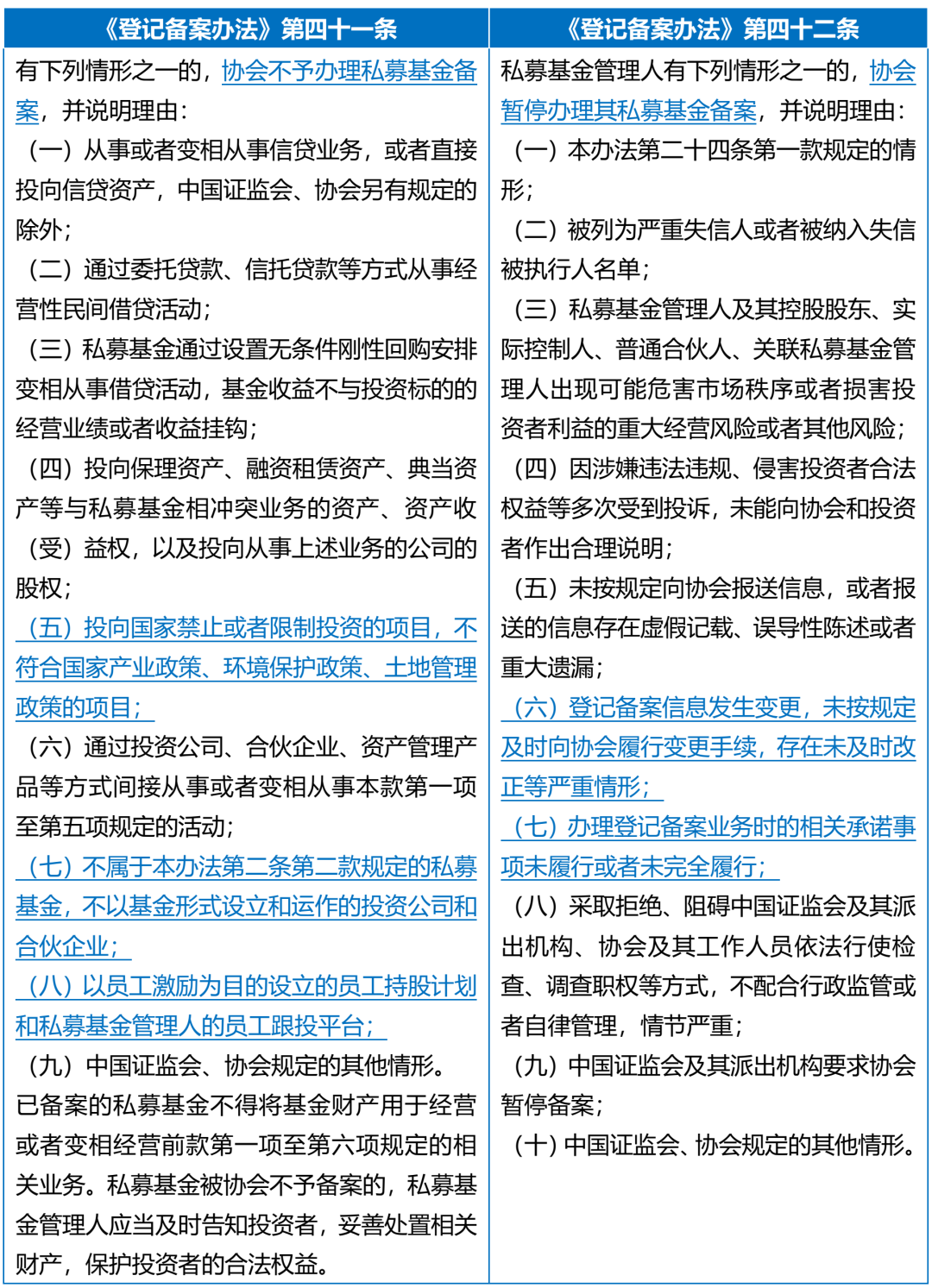 如上所述,基金业协会拟通过本次修订建立全流程的自律体系,在基金备案阶段,除“审慎备案”外,《登记备案办法》在原有自律规则基础上丰富了“不予备案”与“暂停备案”的具体情形。