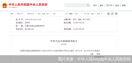 为鼓励私募投资基金行业规范健康发展,更好保护投资者合法权益,进一步发挥服务实体经济、促进科技创新等作用,国务院总理李强日前签署国务院令,并于7月9日公布《条例》,自2023年9月1日起施行。据悉,《条例》共含七章62条,包括私募基金管理人和私募基金托管人、资金募集和投资运作、关于创业投资基金的特别规定、监督管理、法律责任以及附则等多项内容。