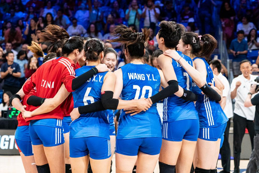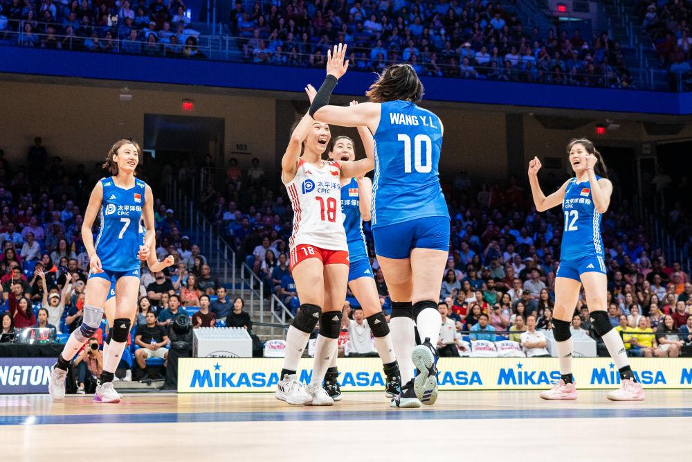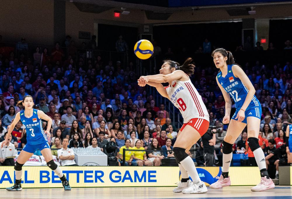 7月15日,中国队球员王云蕗(左一)在比赛中扣球。新华社发(陈晨摄)