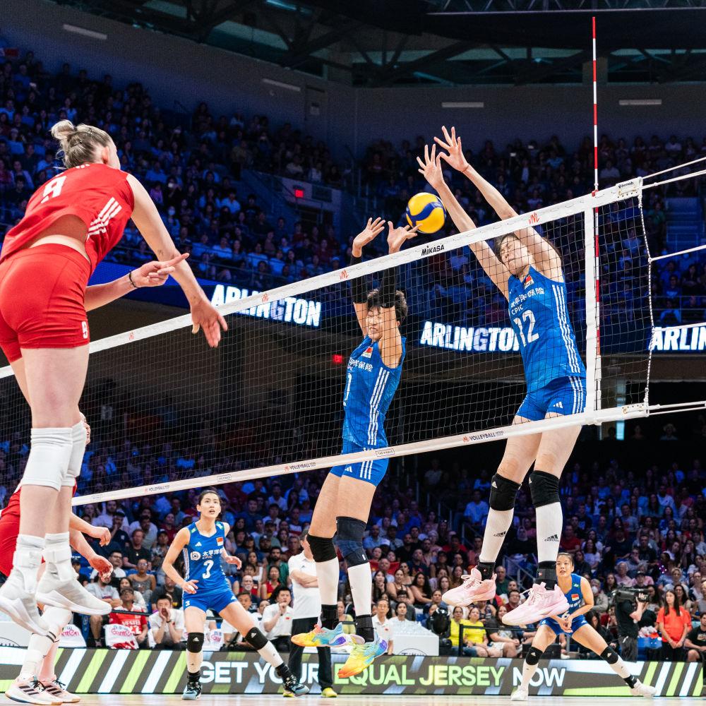 7月15日,中国队球员袁心玥(上左)、李盈莹(上右)在比赛中拦网。新华社发(陈晨摄)